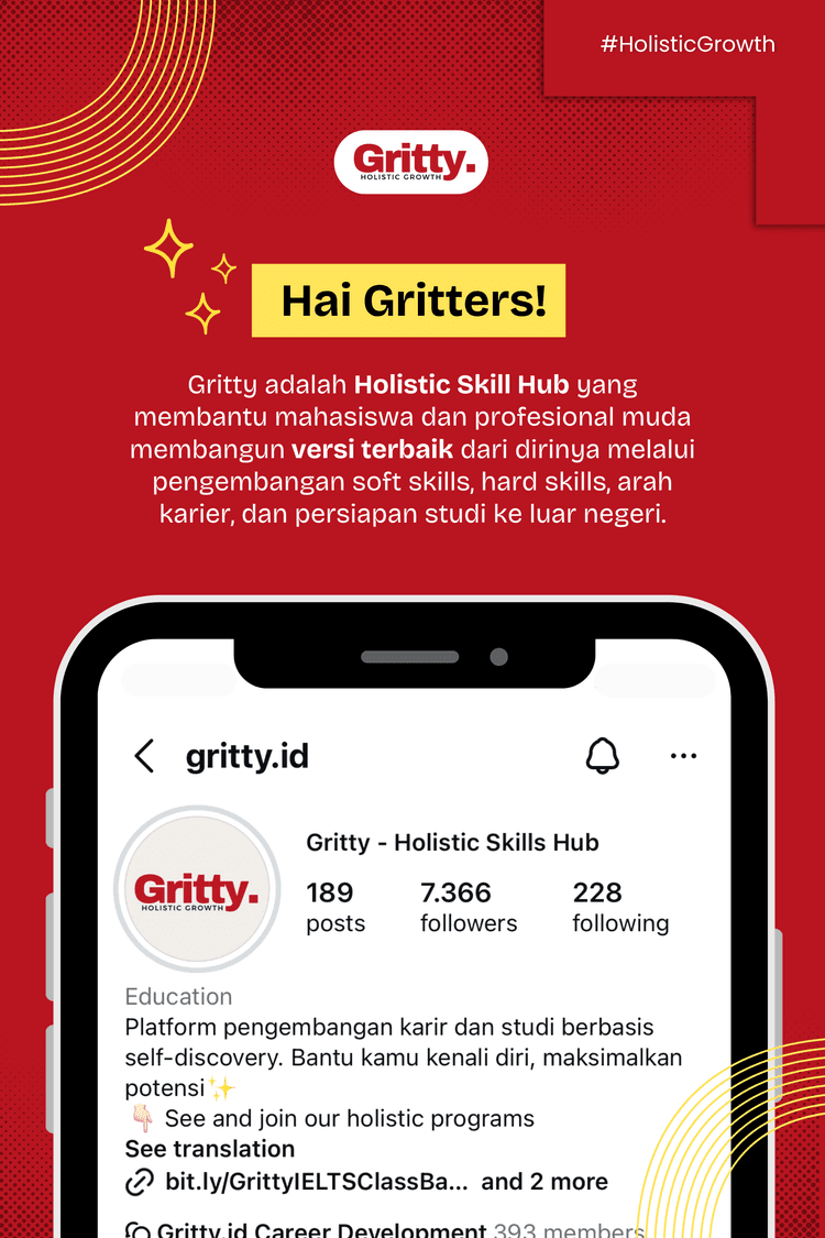 Melalui AI-Powered Self-Assessment, coaching self-discovery, program pengembangan soft skills dan hard skills, hingga mentoring karier dan studi ke luar negeri, Gritty tidak hanya membantu kamu meraih pekerjaan atau beasiswa impian tetapi juga membangun mental yang tangguh, perencanaan hidup yang terstruktur, dan jejaring yang suportif.